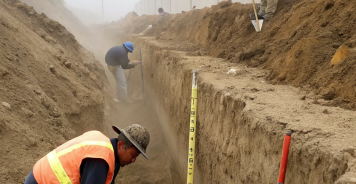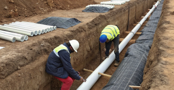 - Засыпка траншей: после укладки труб траншеи засыпаются песком или грунтом.